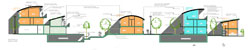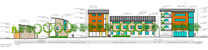A mixed use development with all residential units with living spaces and open spaces facing west or south. Small opes and deciduous landscaping were placed on the north and east sides. Tall volumes were placed to the northwest of the site. The communal landscaped areas were directly additional to private open spaces. No cars allowed for easily overlooked play areas